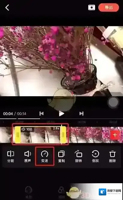 5、这样需要放慢动作的视频部分就会被独立出来。选中视频独立出来的部分之后,点击底部“变速”功能。
