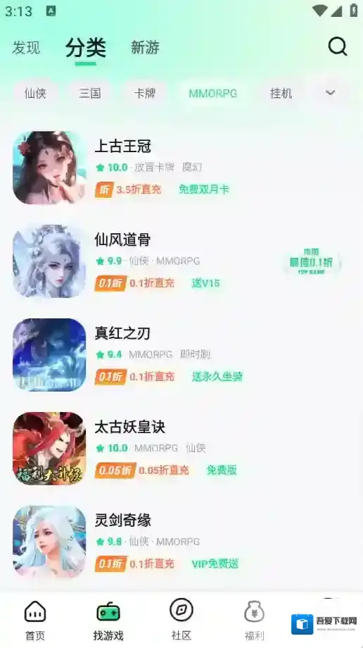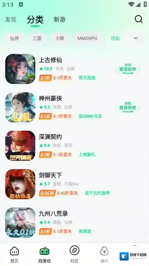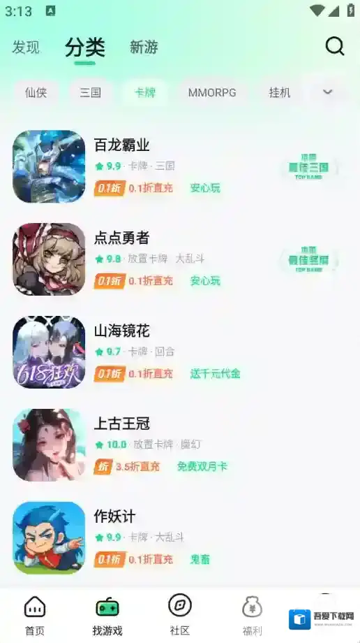 3、“找游戏”页面将游戏进行了详细的归类,包含了三国、传奇以及卡牌等类型。