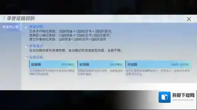 2月2日-4月4日,汽车乐园春季征稿将正式启动,征稿活动开启期间,车手们仅需在汽车乐园发布竞速物理、自动模式的竞速类型地图即视为成功参与,地图主题不限。经过投稿、初筛与评选期,官方评选团将根据赛道设计、视觉设计、创意设计和内容量评出:艺术杰作 独具匠心 潜力作者三档奖项并发放对应的现金 纪念币 乐园币奖励!(奖励详情车手们可以点击下图查看)