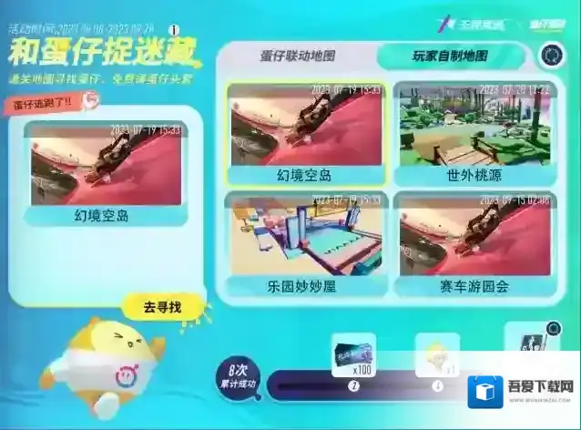– 除了这四张蛋仔带来的联动地图外,车手们游玩其他创作者自制地图,并在其中参与捉迷藏小游戏,也可以累计挑战次数哦~在完成一定次数的捉迷藏挑战后即可解锁可爱蛋仔头套与欢呼的蛋仔动作奖励!