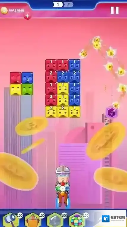 3、上方显示波数、金币数量,画面中有彩色的方块,玩家操控穿着类似宇航服、骑着火箭道具的角色,下方有各种功能按钮,可能是用于辅助消除或增强效果。