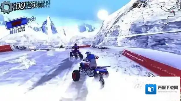 2、在“CAREER”模式,驾驶蓝白ATV,沿越野赛道,避障碍、超对手,积累比赛经验。