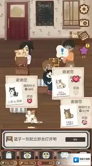 3、当顾客和猫猫互动时会获得爱心,消耗爱心可以开启快递篮子,每次只能打开一个快递。