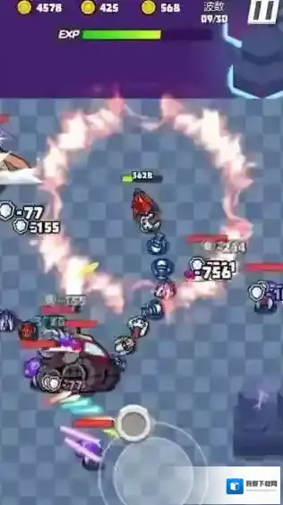 1、画面有“使用摇杆来移动”操作提示,显示经验(EXP)、金币等资源,还有波次(1/10)等信息。