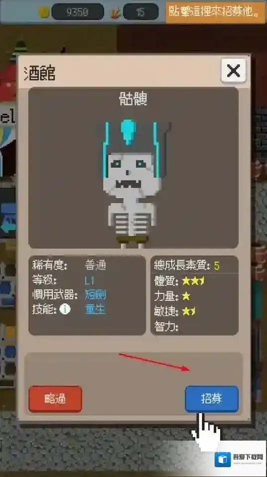 3、“招募英雄”,前往酒馆,查看角色(骷髅)属性、技能,消耗资源招募,组建战斗队伍。