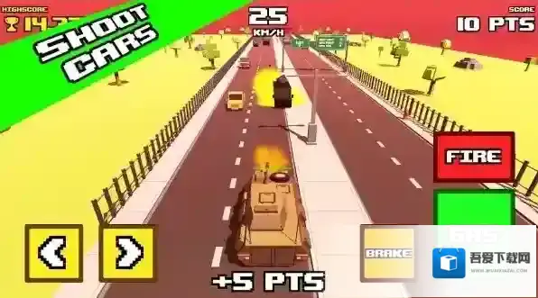 2、在公路场景操控坦克,利用左右箭头按钮转向,“GAS”键加速、“BRAKE”键减速,“FIRE”键射击,需在限时(00:35)内摧毁指定数量车辆(0/5)。