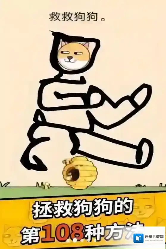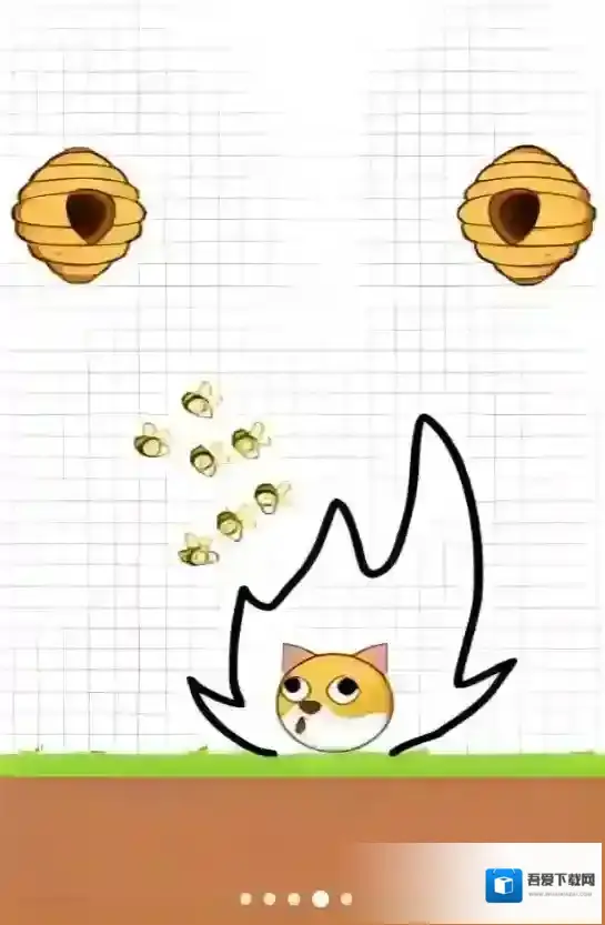 3、第2关蜜蜂从蜂窝飞出,沿箭头方向,画更封闭的线(包围狗狗与平台),隔绝蜜蜂,保护狗狗通关。