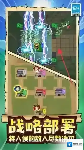 3、“战略部署”,在地图中合理安排防御塔位置,释放技能特效(雷电),消灭入侵敌人。