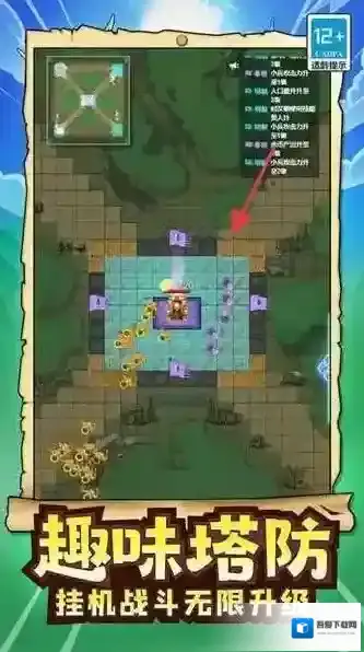 2、“挂机战斗”,布置角色、防御塔后,开启挂机,自动战斗,积累金币,升级防御设施。