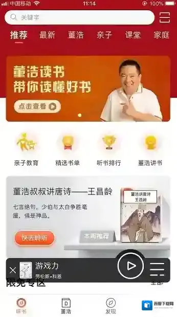 董浩读书APP致力于提供便捷、个性化的阅读体验,特别适合现代快节奏生活中追求知识与文化的用户。其丰富的书籍资源和音频解读功能,将传统阅读与现代生活完美结合。随着数字浪潮的发展,董浩读书APP无疑为书迷们打开了一个全新的阅读世界,让我们能够更好地吸取知识,更新自身的认知视野。在推陈出新的文艺作品中,读者将能获得更多灵感与思考,彷如一次次心灵的旅行。