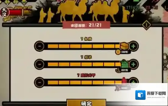 1.规模分配17最合适,7礼物,7粮草,3兵甲,兵甲越多消耗粮草越多,想要走得远,必须携带少量兵甲的,而粮草和礼物可以在探索中补足。