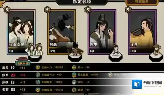 此搭配包含李冰、张仪、庄子、女魃,名臣获取相对容易,性价比高。李冰、女魃、庄子技能可提升民心,并依赖高民心获得高额加成,同时增强军事能力。张仪为春秋必备神卡,其技能让玩家在前期有更多发育时间或进攻性。