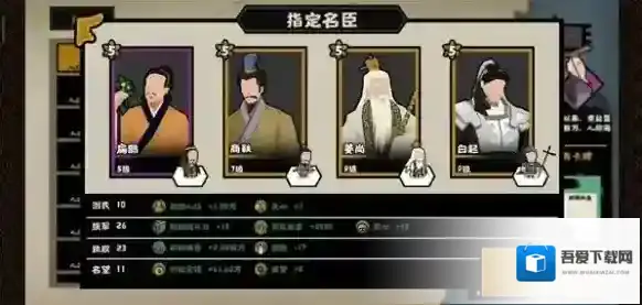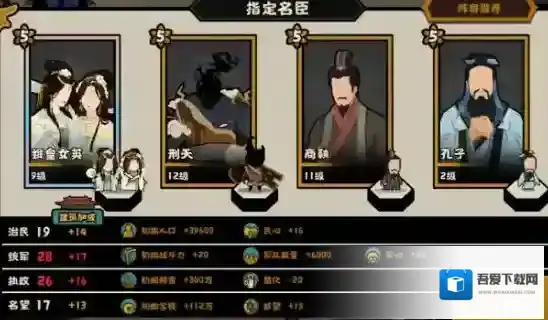 此搭配战斗力强,但获取难度较高,建议氪金玩家优先考虑。包括扁鹊、商鞅(可用张仪代替)、姜尚、白起,拥有无可匹敌的军事能力。前期即可获得高额战斗力和军心加成,出征胜利可夺取军心、民心。姜尚还有封神和奇袭技能,扁鹊可范围回复生命值。此搭配前期可快速扩张,速推必备。