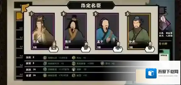 此搭配包括范蠡、张仪、孟子、孙武,核心为张仪、范蠡、孟子。三者技能相辅相成,张仪提高他国好感度,便于前期结盟,触发范蠡和孟子技能,大幅提升钱粮产量。孙武技能出征胜利即可获得威望,威望超过七十时,可触发与张仪、范蠡的用间技能,提升战斗力和用间等级。此搭配前期钱粮收益极高,无负面效果。