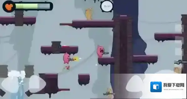 2、呈现横版闯关场景,有粉色火柴人角色、武器、关卡地形等元素,玩家操控角色在关卡中战斗、收集武器、闯关,画面含时间、血量条等界面信息。