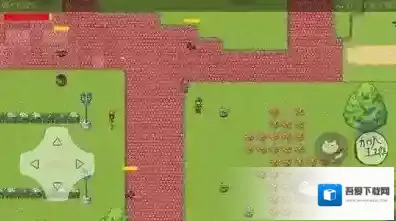 3、呈现角色(像素人物)、场景(草地、树木、道具木桶)、操作按键等,是角色在场景互动、探索的界面,玩家可操控角色移动、互动,开展生存或冒险玩法。