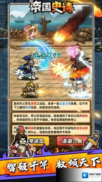 帝国史诗,以三国背景为题材的文字冒险类肉鸽RPG手游。我们将会来到热血的三国时代,在这里开启你的霸业之旅!无需什么复杂的操作,轻松点击推剧情,过五关斩六将,享受畅快杀敌的爽快玩法!在闯关过程中可以自由的去搭配自己的技能组合,每一局的选择都可能不相同,策略性十足,更多丰富多样的玩法模式任你选择,让你畅享酣畅淋漓的战斗盛宴!
