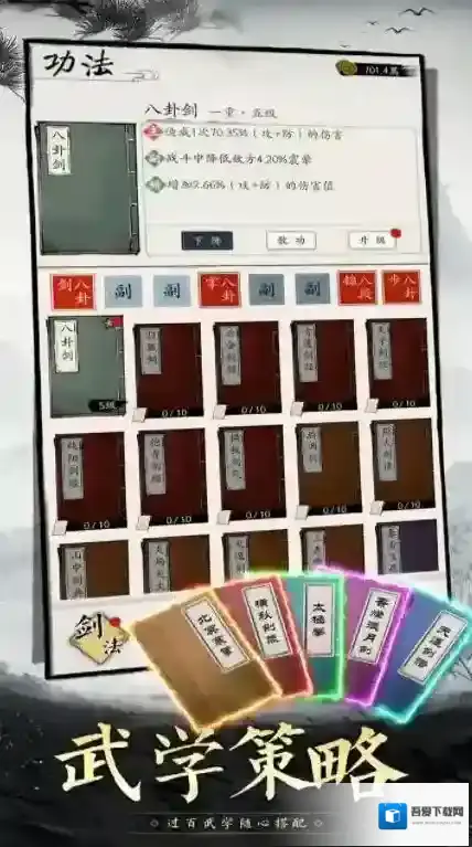 2、数百种不同的武学可以让你自由搭配来闯关,每一种武学招式都可以让你自由选择来使用。