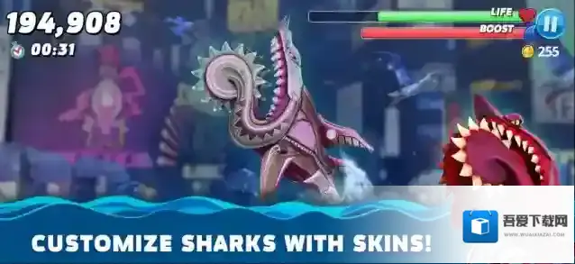 1、有很大的鲨鱼可以让玩家去选择使用,丰富的装备可以自由搭配来打造不同的鲨鱼。