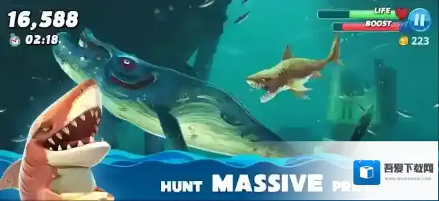 3、对弱点冲刺攻击。攻击成功,螃蟹会暂时逃开,深海饥饿鲨游戏攻略我们的鲨鱼趁机到周围捕食进餐马上回来。(注意不要出洞)循环数次,即可击败巨型螃蟹。