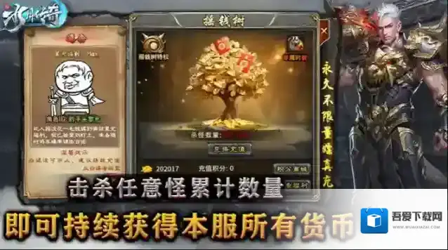4、摇钱树:不需过多介绍,陪伴你从开局到封神的福利功能,每击杀100只任意怪即可兑换一次充值,永久不限量嫖真充和元宝。