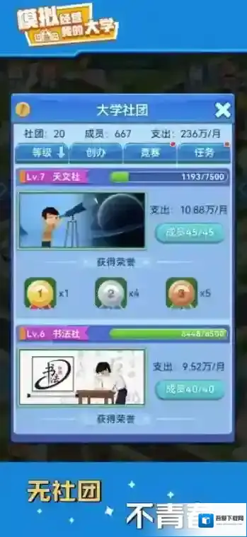 7、社团,不需要花费太多精力在这个上面,任务也不需要搞(国家资助任务可以弄弄),只需要扩建然后造出所有社团让他们自己比赛拿奖升级就行。