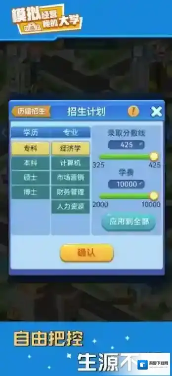 6、玩家自定义录取分数线和学费,分数越高入学学生能力越强,而且,学费高一点的话,前期学校发展也有足够的资金;