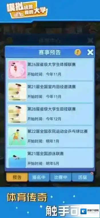 5、体育中心,这个是学校到达四级之后才可以操作的玩意,不过你要玩体育赛事的话前几年就可以开始操作了。你的学校快要到达四级的时候,就可以把田径场、游泳馆、射箭场、网球馆、击剑馆、足球场、篮球馆、排球馆、体操馆、乒乓球馆、羽毛球馆都各建一个,(前提是建完后钱还剩下一两亿!为什么不直接说全部各建一个是因为有些人理解能力不太好)建好后点击管理-队伍-招生了,只招一级体育生和国家级和国际级的就行,其他的用处不是很大,然后定期记得训练定期招体育生就行(意思就是一结束招生和训练就马上开始下一轮),建议能早点搞体育赛事就早点搞,声望后期很难办。体育场的扩建,也是能提早扩就提早扩,因为扩建一次要三年,特别慢,建议没到四级学校前就扩到满级,也还是升完后还有一两亿存款前提下。