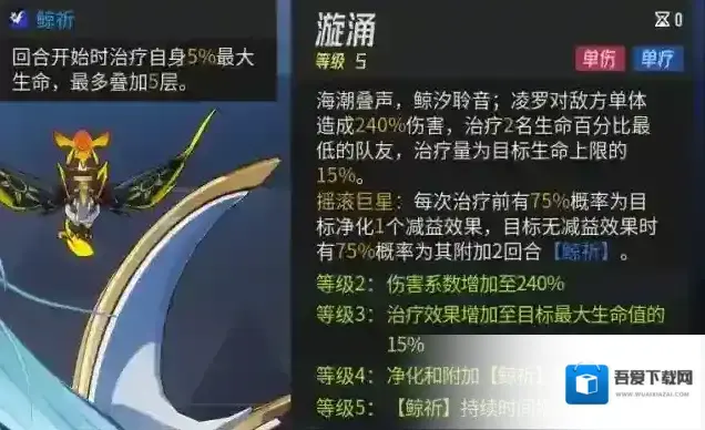 鲸祈:治疗的时候还能有75%概率驱散debuff,而且每一层都能治疗5%生命。
