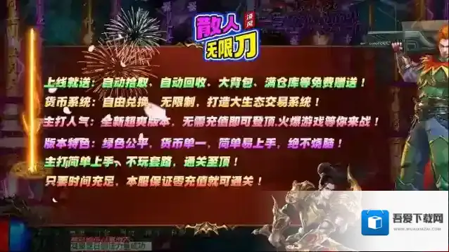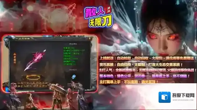 凌风散人无限刀,195单职业无限刀版,全新超爽版本,无需充值即可登顶,火爆内容等你来战!上线就送自动拾取、自动回收、大背包和满仓库,助力玩家轻松刷怪,打包升级两不误!本服一切装备全靠打,主要材料怪物均可爆,只要时间充足,不氪金照样能够通关!不仅如此,游戏内货币可以自由兑换,打造大生态交易系统,让所有人都能玩的畅爽!