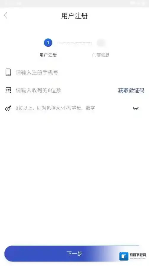 2、进入用户注册界面,依次填写手机号、验证码和密码后,选择下方下一步选项。