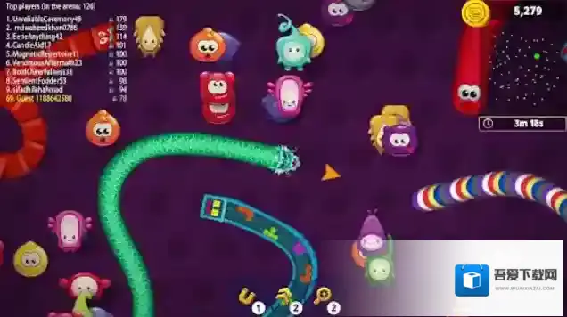 2、操控蠕虫寻找食物,靠近即可食用,增加自己的长度。