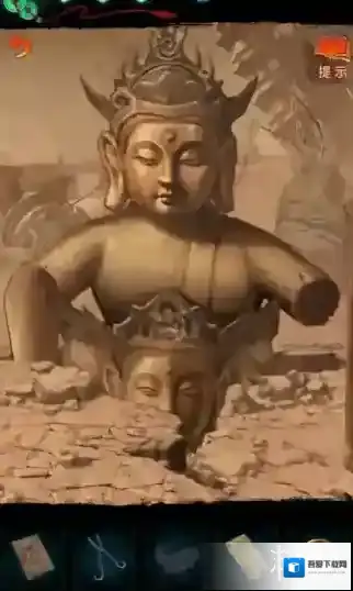 3、进入小门后,玩家可以看到众多的佛像。接着,玩家的目光被左侧躺着的佛像尖刺机关所吸引。这个机关设计精巧,在成功调整机关后,玩家可以获取珠子以及雕像断臂等重要物品。
